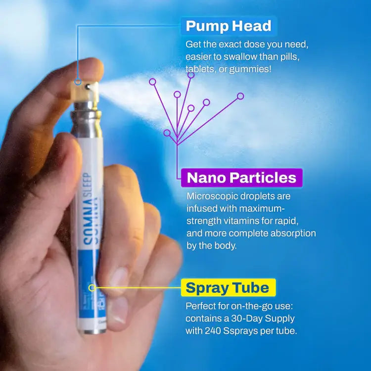 Our unique sleep-promoting spray, Somna, is so effective that we use 1/3 to 1/5th the amount of melatonin of our competitors—yet our customers report better, more restful sleep, and more energy in the morning.